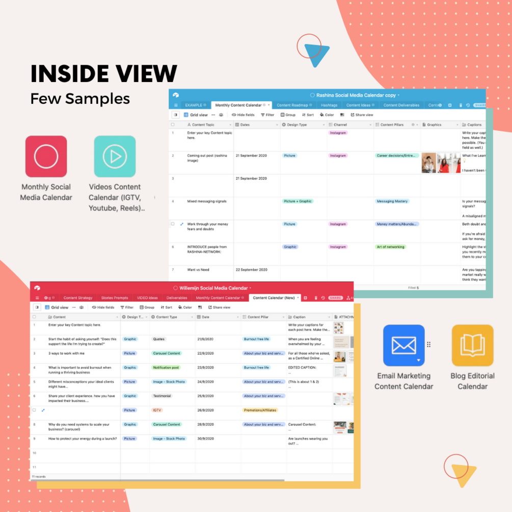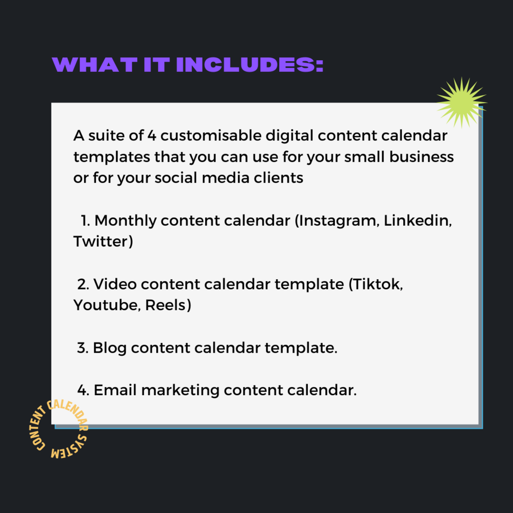 A suite of 4 customizable digital content calendar templates that you can use for your small business or for your social media clients.